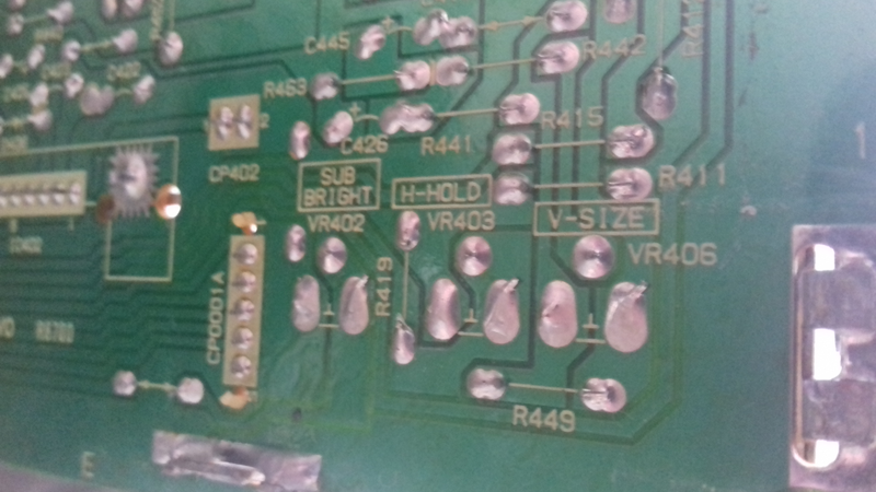 CM14 UK version - part of PCB showing solder connections for sub-bright, H-Hold and V-Size variable resistors.